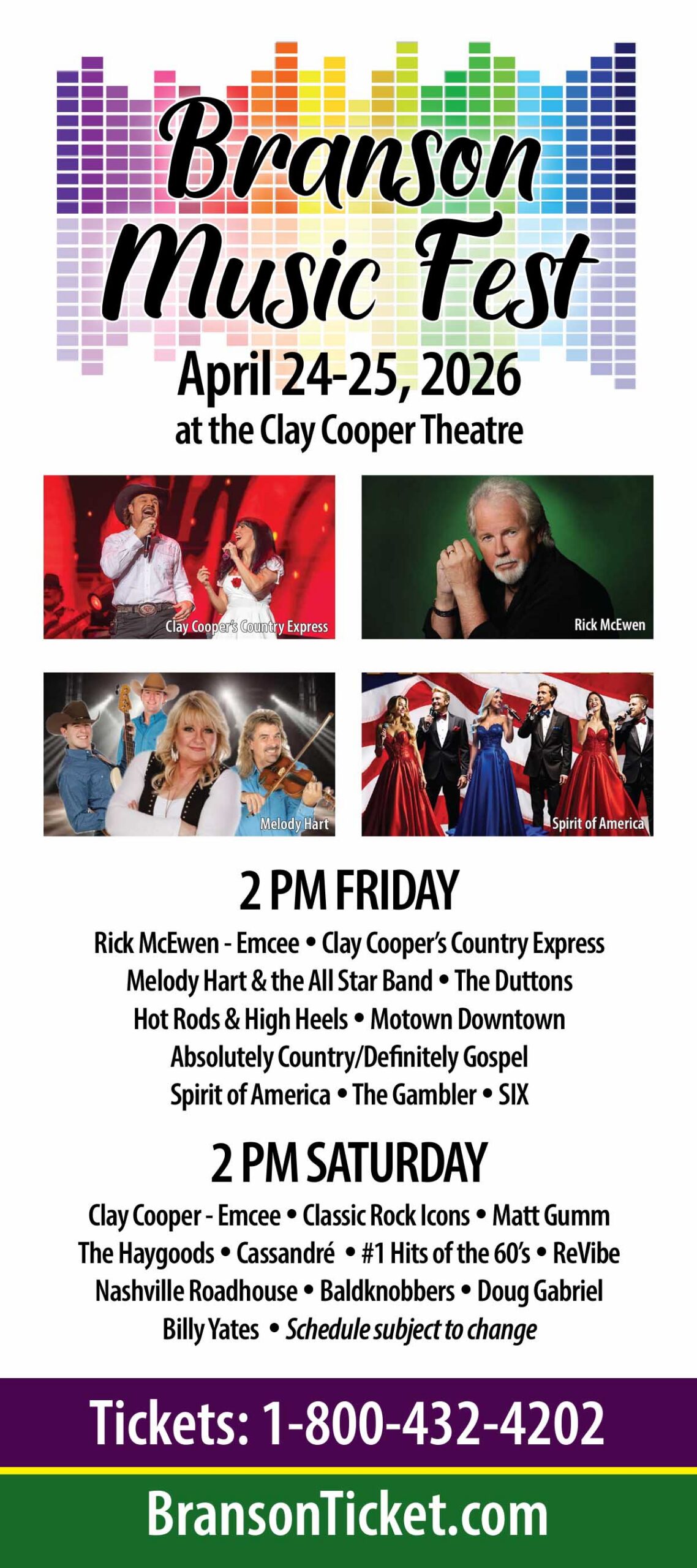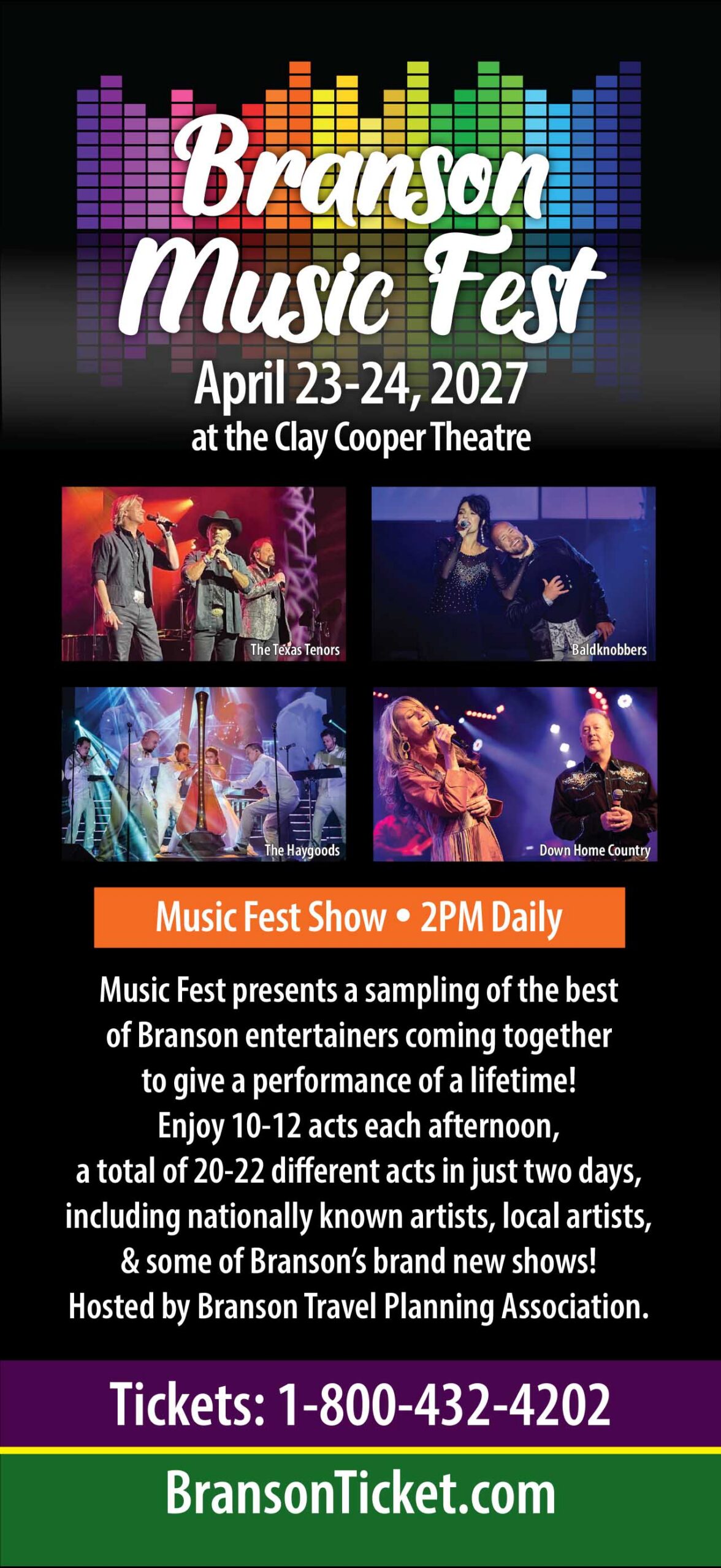 The 14th Annual Branson Music Festival is set for April 24 and April 25, 2026 at the Clay Cooper Theater in Branson, Missouri, with performances running from 2 PM to 5 PM each day. This two-day showcase features more than 20 top Branson performers in one exciting event that celebrates live music, variety acts, and Branson’s rich entertainment scene. Guests can experience an incredible mix of country, gospel, rock, comedy, and family-friendly entertainment that highlights why Branson is known as the live music show capital of the world.