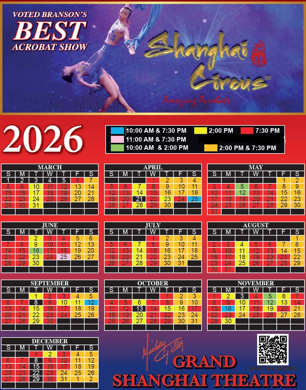 Grand Shanghai Circus delivers an all-new, higher level of entertainment with the authentic costumes, dance, music and scenery. Imagine being swept away to Shanghai for a two-hour escape. Celebrating 25 years in Branson these professional athletes’ dazzling performances offers more variety this year than ever before. Every age will be amazed with the entire full-scale production through twenty different acts of perfection including talents like breathtaking acrobatics, colorful dance, surprising comedy, mystifying magic and high-flying aerial feats strength.